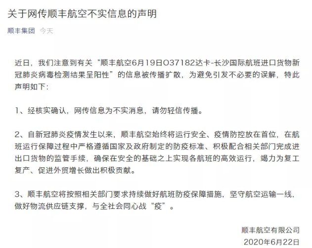 6月22日,微博有人发文称,“顺丰航空20日下午四点钟,接到长沙海关的通报,19日21点23分抵达的O37182达卡至长沙航班全货机,货物中检测到新冠病毒呈阳性。”