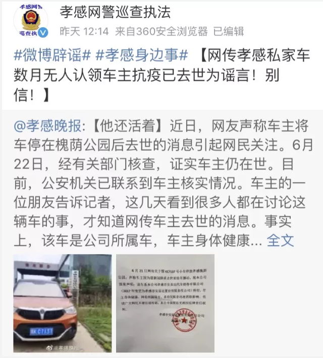 谣言:湖北孝感一私家车无人认领车主抗疫去世