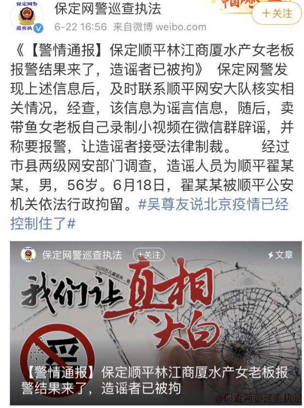保定网警发现上述信息后,经查系谣言,造谣者为顺平县翟某某,男,56岁。6月18日,翟某某被顺平公安机关依法行政拘留。
