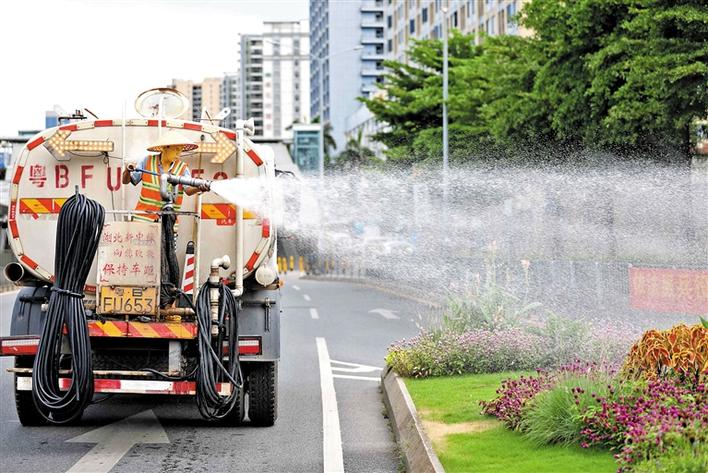 龙华大道与石清大道交会路口,园林绿化工人浇灌道路绿化带。