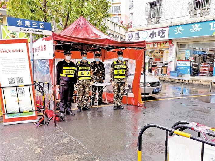 民强社区工作人员在雨中坚守社区卡点。