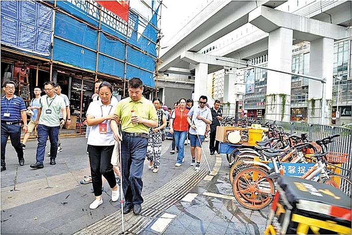 人大代表实地视察盲道项目。