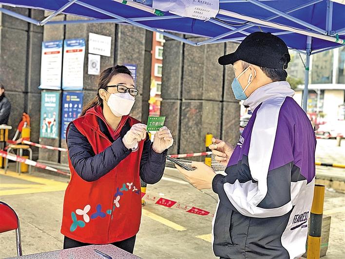 社区志愿者支援辖区企业做好进出员工登记工作。