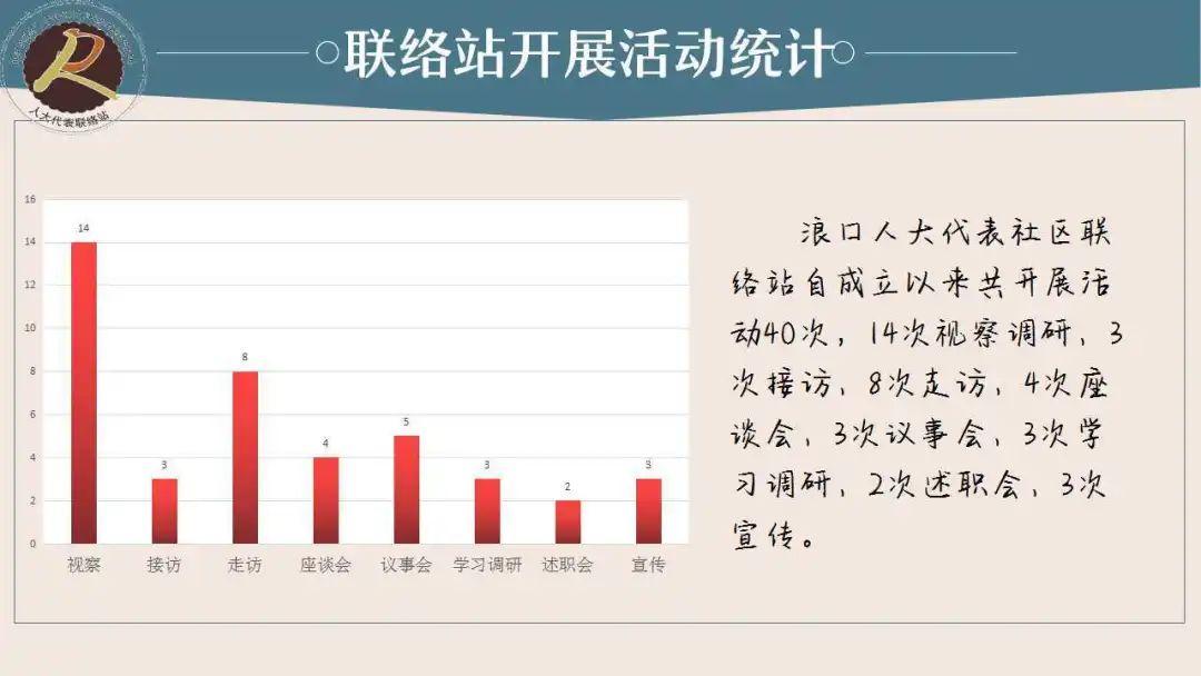 联络站成立以来,截至2020年6月,共开展视察调研活动14次,走访接访11次,代表议事会、代表述职会、座谈会等活动15场。