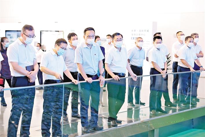 龙华区委书记、区长王卫在光明区委书记王宏彬、区长刘胜等陪同下参观光明科学城展示中心。