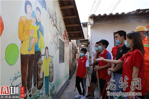 结束后,大家拿着清洁工具穿过一条狭窄的小巷,映入眼帘的竟是古色古香的瓦屋和青石板路,原来这里还有这样一片隐藏的美景。在老村综合整治后,特色的客家瓦屋被保存了下来并绘上了各具风俗民情的墙绘。一名本地义工为大家一一讲解着画面中的场景,行走在白墙黑瓦之间,穿行过狭长曲折的石板路,感受着客家传统文化。经过祠堂,环卫工爷爷为大家讲述着当年吃大锅饭的情景,仿佛置身于时光长河中。