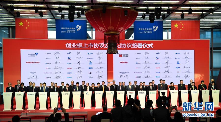 8月24日在深圳证券交易所举行的创业板改革并试点注册制首批企业上市仪式上拍摄的创业板上市协议及登记协议签署仪式。新华社记者毛思倩摄