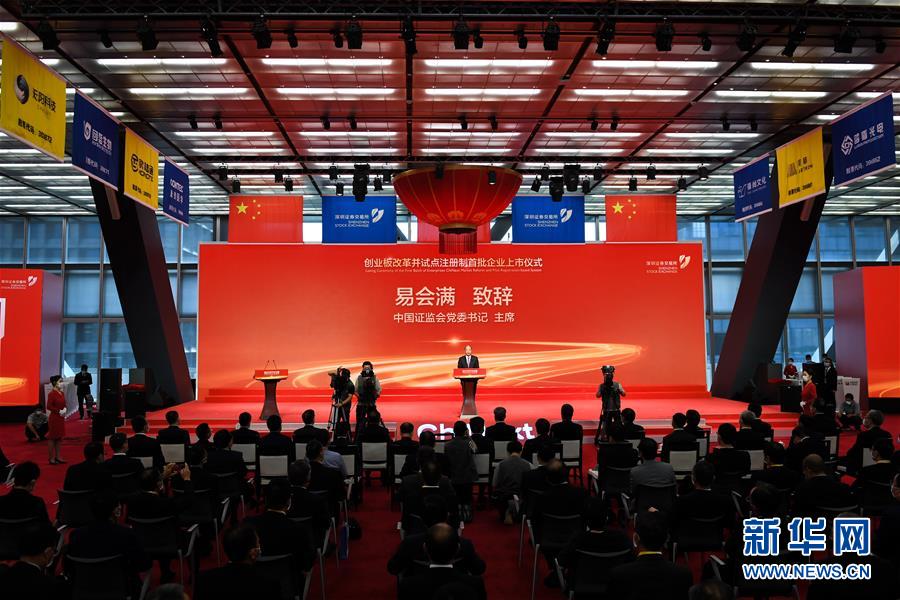 8月24日,在深圳证券交易所举行的创业板改革并试点注册制首批企业上市仪式上,中国证监会主席易会满致辞。新华社记者毛思倩摄