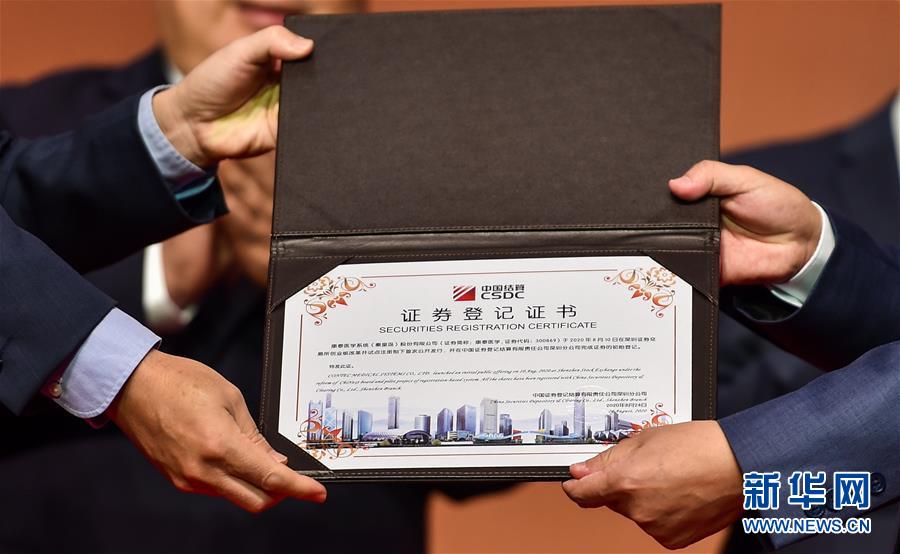 8月24日,在深圳证券交易所举行的创业板改革并试点注册制首批企业上市仪式上,上市企业收取证券登记证书。新华社记者毛思倩摄