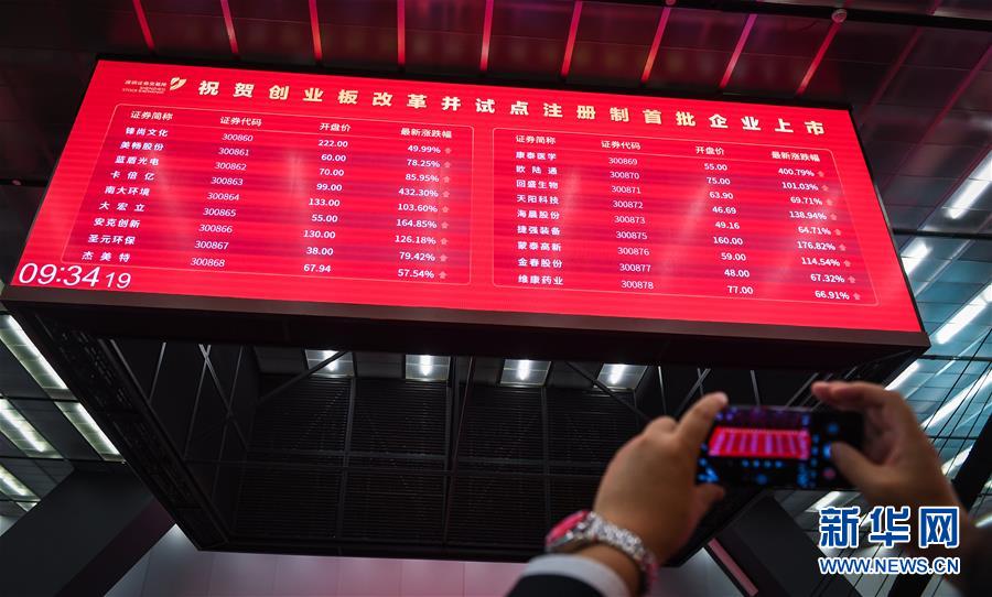 8月24日,在深圳证券交易所举行的创业板改革并试点注册制首批企业上市仪式上,嘉宾拍摄上市企业股价。新华社记者毛思倩摄