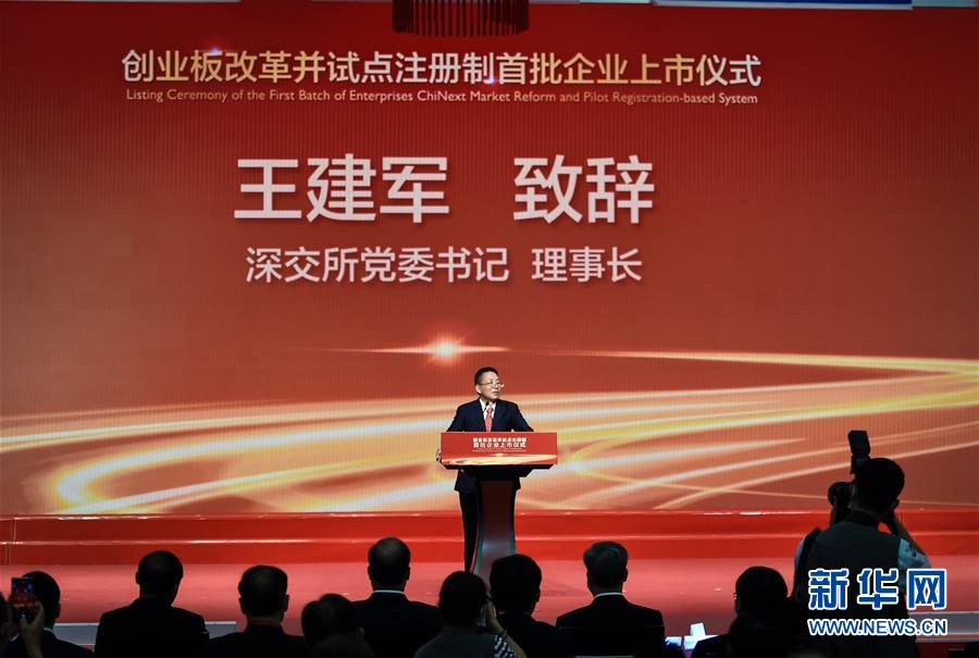 8月24日,在深圳证券交易所举行的创业板改革并试点注册制首批企业上市仪式上,深交所理事长王建军致辞。新华社记者毛思倩摄