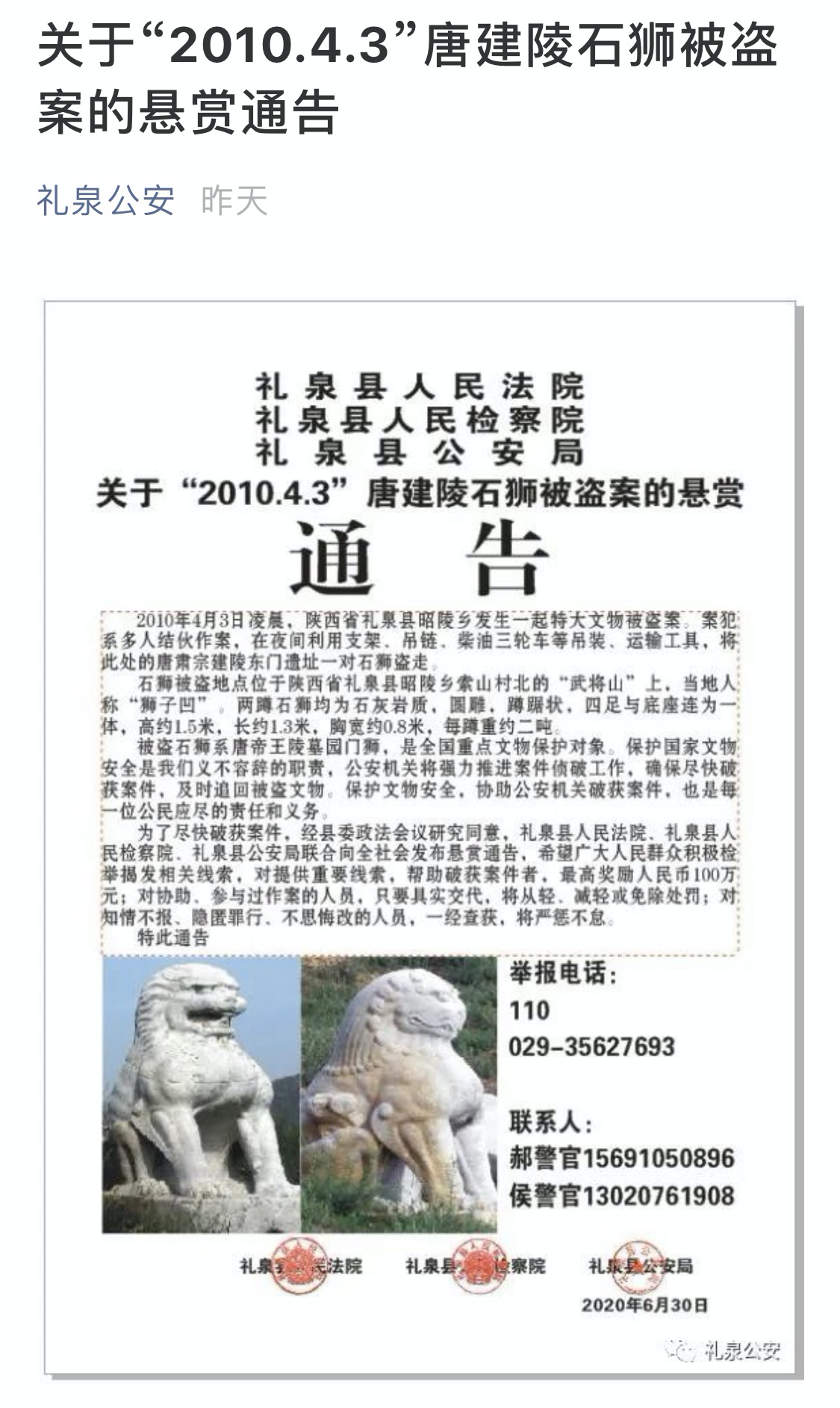 据西安商报,石狮子被盗后的10年来,当地相关部门一直在努力追查,并先后发布过10万、20万的悬赏通告。近日,为了能获取更多更好的相关信息,当地公检法联合发布最新通告,将悬赏金额提至100万元。