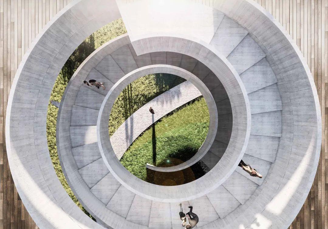 共享大厅——通过入口的大台阶串联起整个校园的一到三层,从地面到达三层大平台,最大程度优化了学生到达各个功能空间的流线,同时大台阶形成校园开放的共享与交流平台。