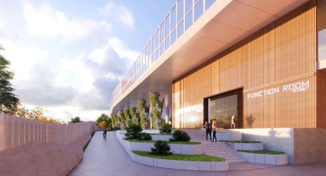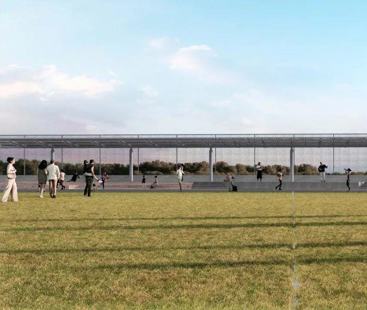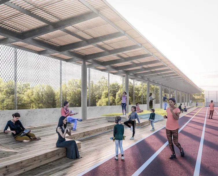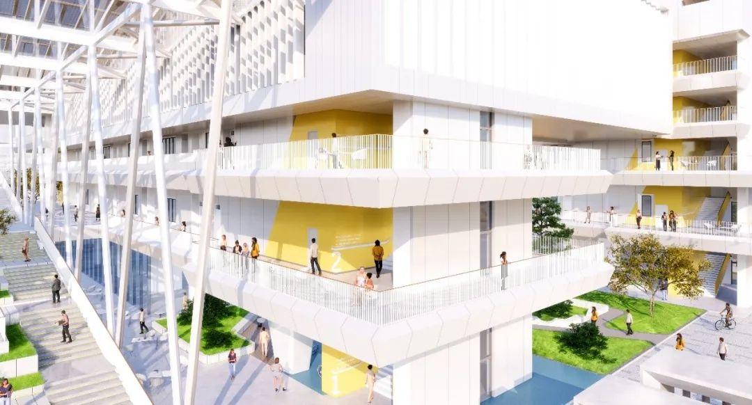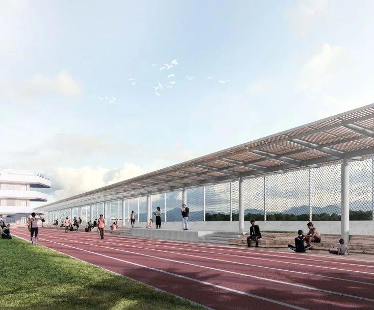 双地面层——利用屋顶平台形成运动场活动空间,与北侧体育综合体形成体育功能性连接。开阔屋顶平台形成校园的第二地面,教学楼与宿舍的阳台形成视线开阔的观景空间。