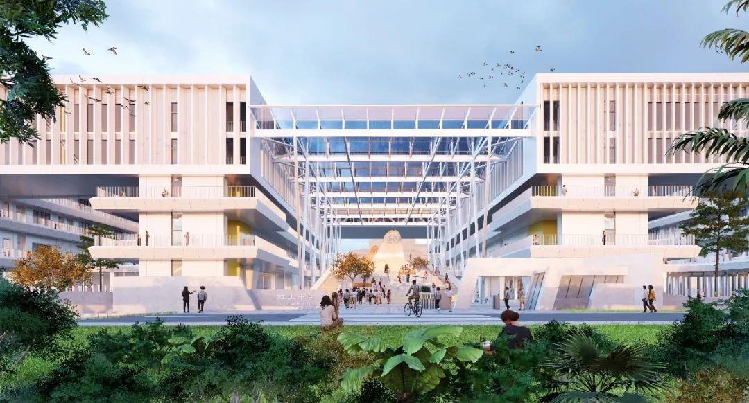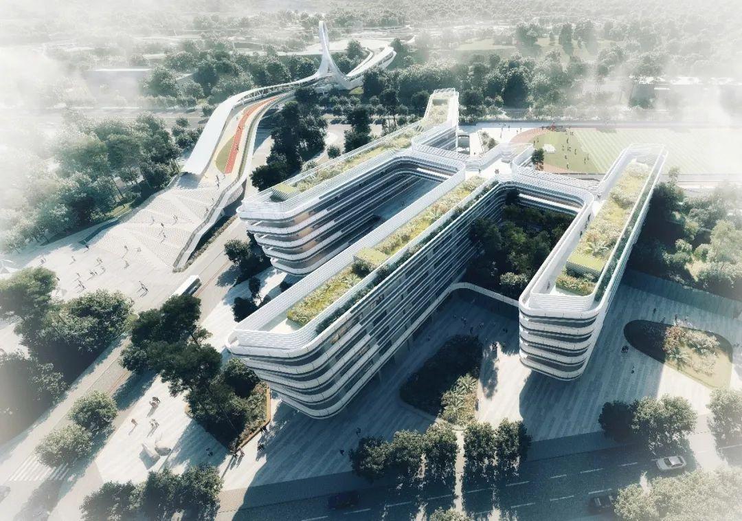 项目主体面对人行主流方向,以极具冲击感的张力预示学子高飞迎向美好未来的祝愿,校园形象令人印象深刻,交通动线直观且便捷,实现更有效率的建筑空间使用的同时,向周边景观资源界面打开,充分发挥自然优势,呼应“龙华之光”的自然生态设计理念。