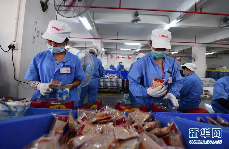 8月30日,在柳州市螺蛳粉产业园广西中柳食品科技有限公司生产车间,工人在生产线上包装螺蛳粉。新华社记者 黄孝邦 摄