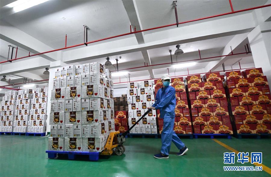 8月30日,在柳州市螺蛳粉产业园广西中柳食品科技有限公司生产车间,工人将包装好的螺蛳粉搬进仓库。新华社记者 黄孝邦 摄