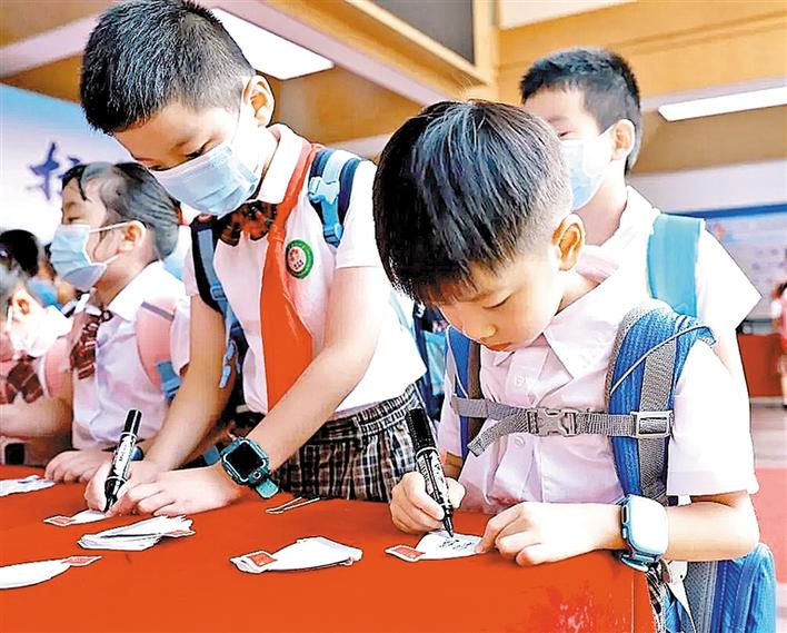 龙华中心小学一年级新生在象征理想与心愿的“风帆”上写下自己的名字。