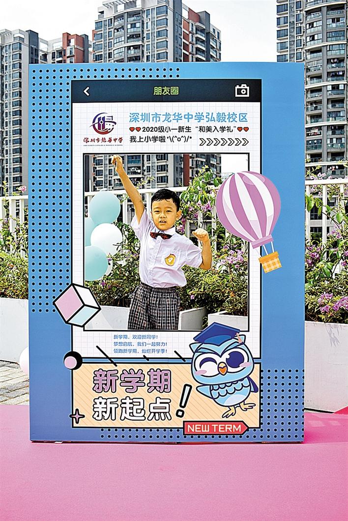 “妈妈,快来快来,我要和它合影,它好可爱。”在民治小学门口检测完体温,小朋友立马被七彩门吸引住了,纷纷拉着家长的手前去合影。报到现场还有老师为新生发放礼物——一封信。