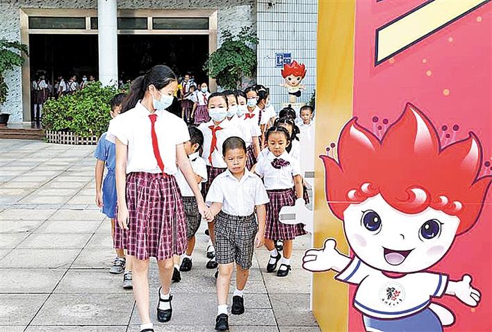观澜二小高年级学生带着一年级新生走进校园。