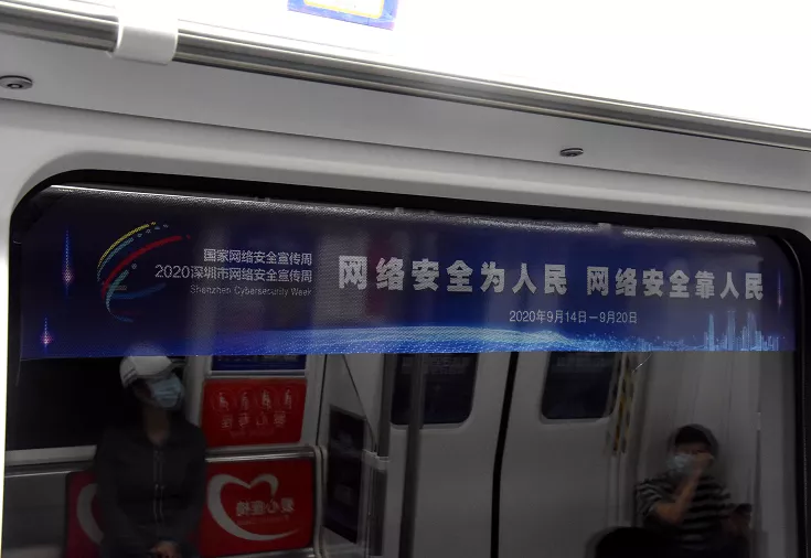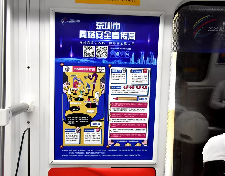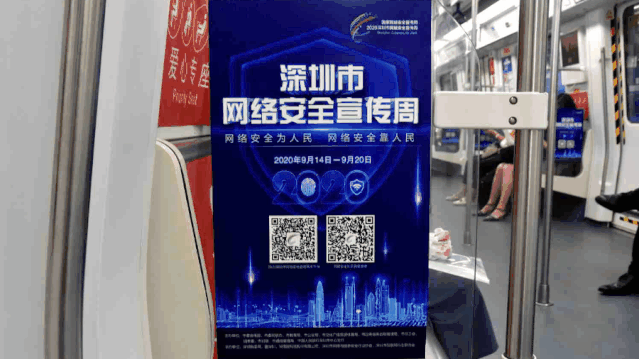 最近一周,深圳的市民可能都发现了, 无论走到哪里,抬头低头都会偶遇一个主角 ——2020年深圳市网络安全宣传周! 尤其是公共出行的小伙伴们, 会发现 一号线它变了, 摇身变成了“网络安全号”! 9月13日, “网络安全号” 地铁专列亮相深圳, 在地铁一号线正式上线。 “网络安全号”地铁专列 可以说是颜值与内涵齐飞了: 以蓝色为主色调, 呼应本次全国网络安全宣传周的主调蓝色, 营造出浓郁的科技感氛围。 不论是车厢内车窗、车门、看板, 还是车椅, 均有网络安全的标语和漫画, 便于乘客在搭乘地铁时, 了解网络安全相关知识。 “网络安全号”列车 用高颜值和满满的“干货” 吸引了不少市民的关注↓↓↓ 用接地气的创意、 易懂的方式, 普及以往大家觉得 专业而晦涩的网络安全知识, “网络安全号”地铁专列做到了! 同时,一批绘有网络安全宣传语的 公交车已经上线运营, 成为城市里“流动的风景线”。 这条线路途经深南大道、新洲路等繁华路段, 主题公交车车身印有 “深圳市网络安全宣传周” “网络安全为人民·网络安全靠人民” “2020年9月14日—9月20日”等字样, 让网络安全观念深入人心。 公交站台候车亭也张贴了 网络安全知识宣传海报, 营造网络安全人人有责、 人人参与的良好氛围。 此外,全城地铁、公交、楼宇的电视终端、 明厨亮灶展示屏、户外广告大屏 同步滚动刊播 主题宣传片和海报, 生动实用的知识不断增加中…… 快来和你身边的“2020年网络安全宣传周” 偶遇打卡吧! 等等,还不过瘾吗? 精彩不断,陆续有来! 启动仪式、鹏城讲堂、湾区安全“圳”先行论坛, 创意作品展示…… 还有如火如荼的网络安全知识有奖竞答, 最高50元微信红包等你拿! 赶紧扫描下方二维码, 登陆参与吧! 长按屏幕识别二维码登录深圳市网络安全宣传周主平台 长按屏幕识别二维码参与网络安全知识有奖竞答活动
