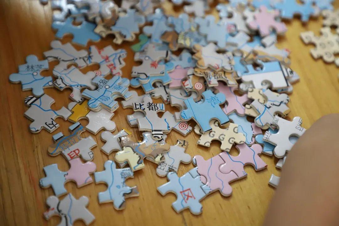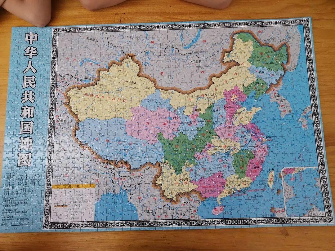 经过合力寻找,在书柜缝隙里找到了丢失的碎片。花了将近三个小时最终合作将一张完整的中国地图,无一错漏地拼凑完成。大家围在桌子边叽叽喳喳地欣赏着这幅共同的作品