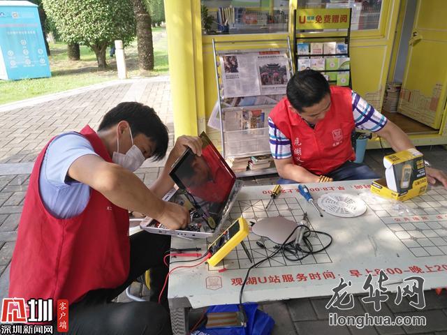 为了能让大家开心愉快地享受假期,观湖U站在组织5名专业义工为市民义务理发。爱心便民义剪公益服务是观湖U站推出的一项便民服务项目,环卫工人、市容巡查员、外卖小哥、快递员和周边居住的中老年人都是他们服务的对象。同时,观湖U站还组织了3名专业义工,在U站开设“雷锋岗”家电维修,假期为市民提供家电维修、电脑维护等便民公益服务,深受群众喜爱。假期出行市民增多,因此来问路、咨询的市民也络绎不绝,值班义工都微笑着一一回应,认真解答。观湖U站是环卫工们的“爱心歇脚点”,不但免费为环卫工人提供饮用水,还无偿为他们提供各类应急药品,爱心电话等便民服务,现场不时有环卫工来装饮用水,义工们也是热情服务。