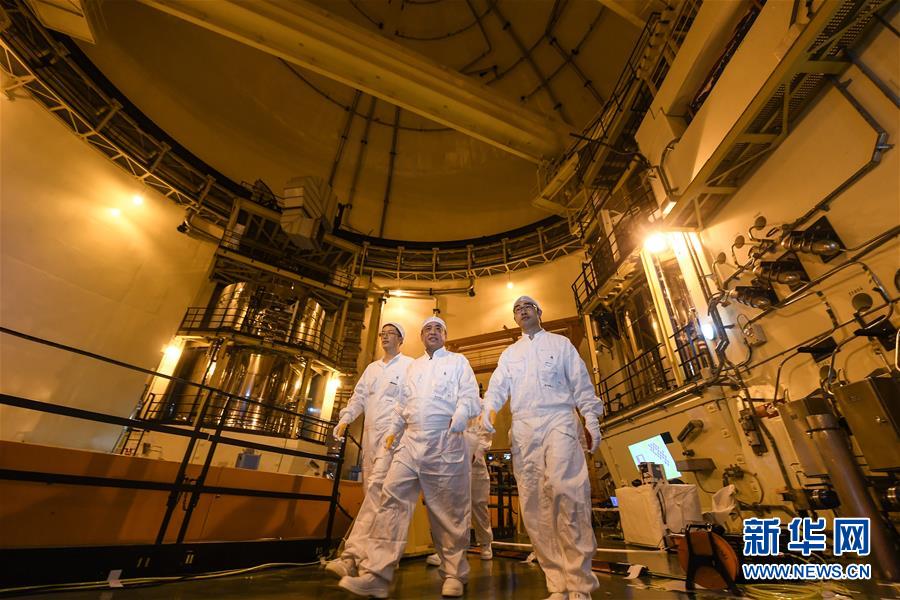 2019年4月12日,在深圳大亚湾核电站2号机组核心区,乔素凯(中)和团队成员结束工作准备离开。新华社记者毛思倩摄