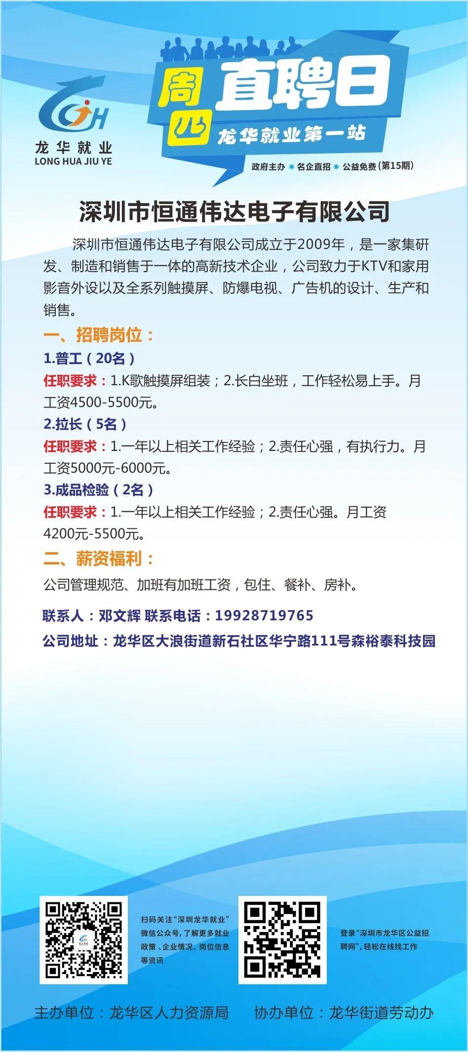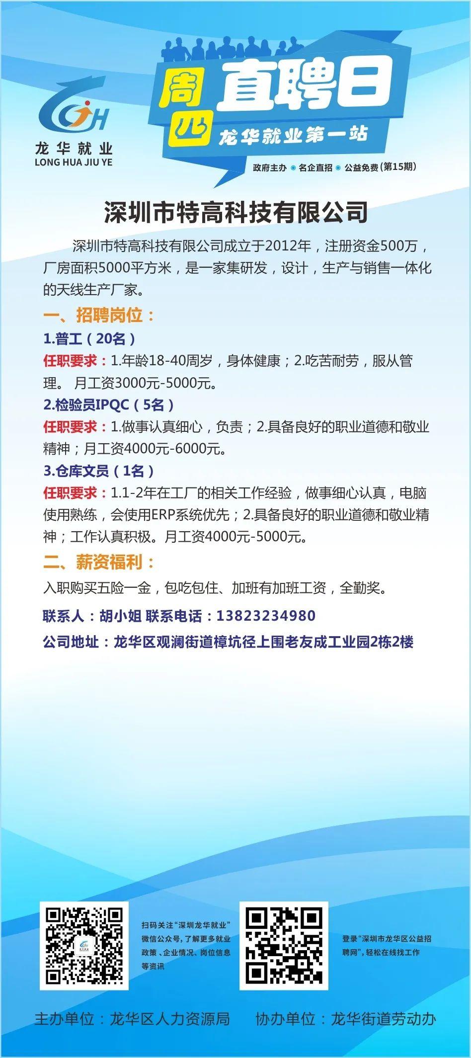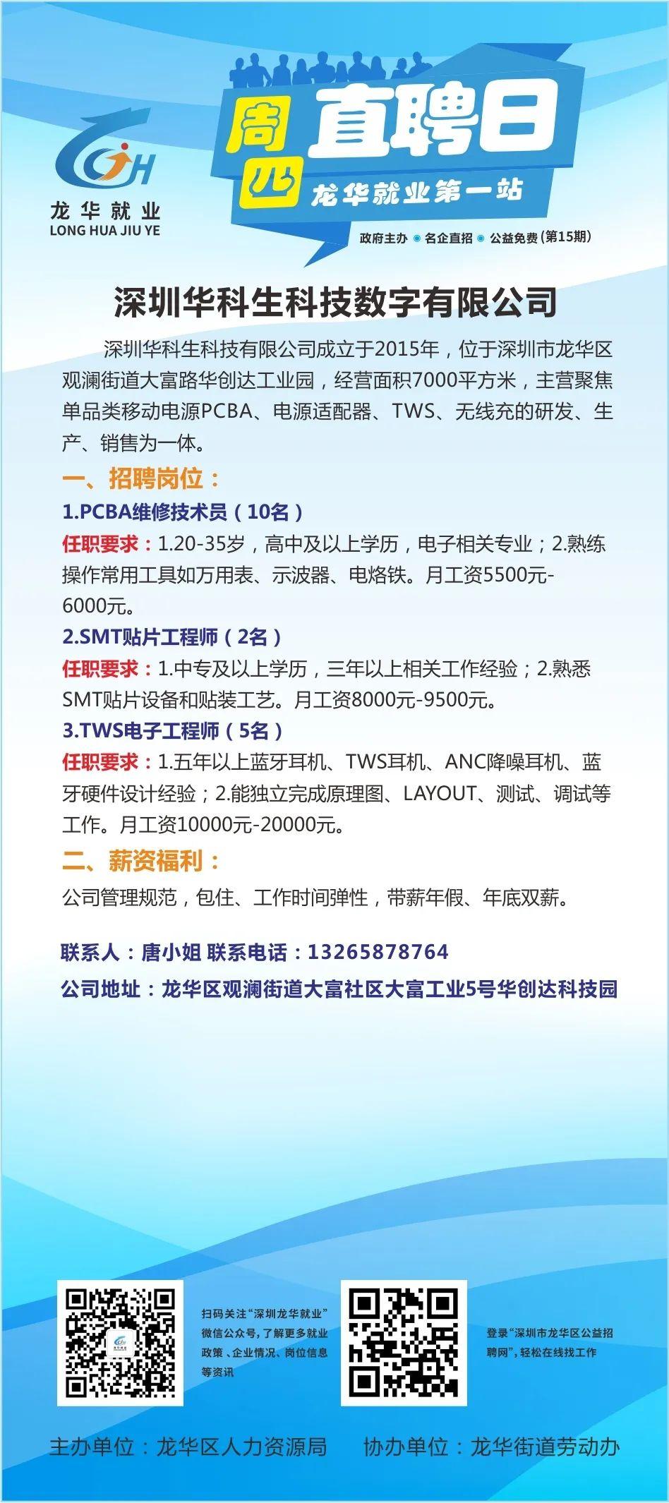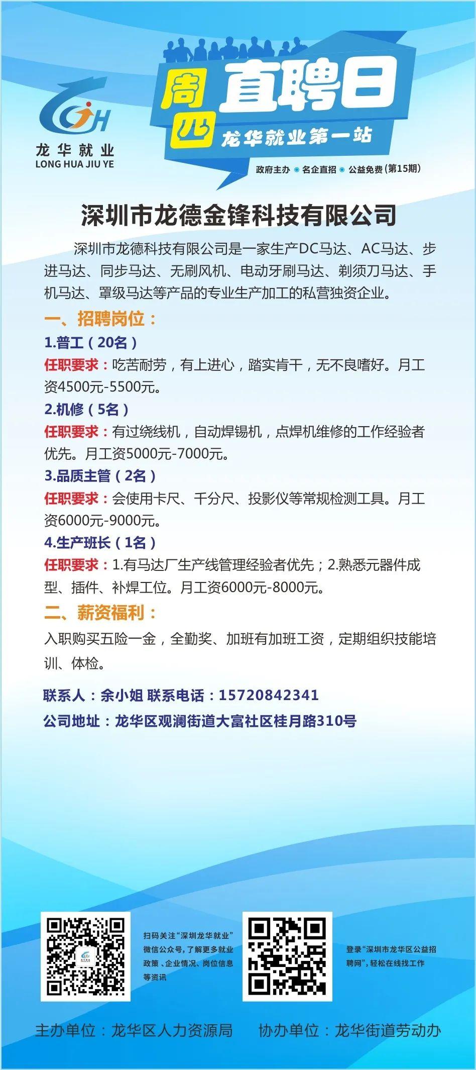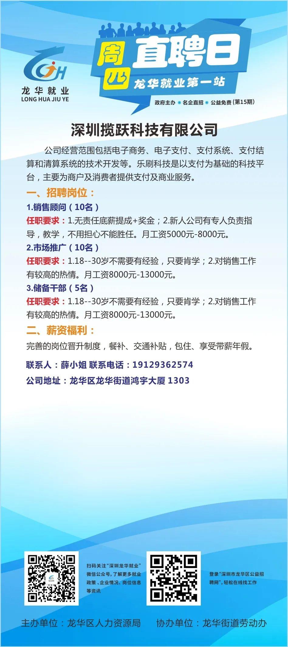 本周四(明天)上午九点,第十五场“周四直聘日”活动仍将在龙华就业第一站(龙华汽车站左侧)举行。以下是参加活动的10家企业招聘信息!找工作的小伙伴们,记得带上简历准时去龙华就业第一站和企业HR面谈哦!