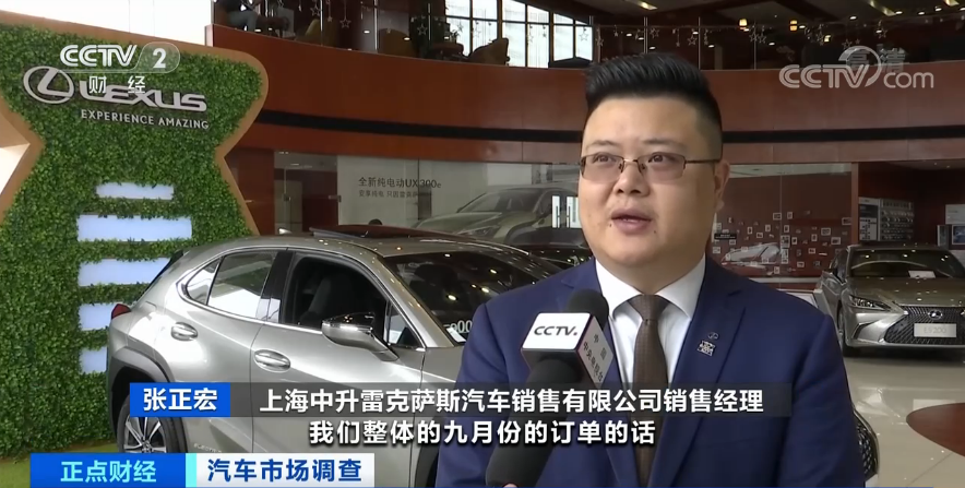 上海中升雷克萨斯汽车销售有限公司销售经理张正宏:我们九月份的订单达到209台,和去年同期相比提升15%左右,十一黄金周的订单量达到了105台。