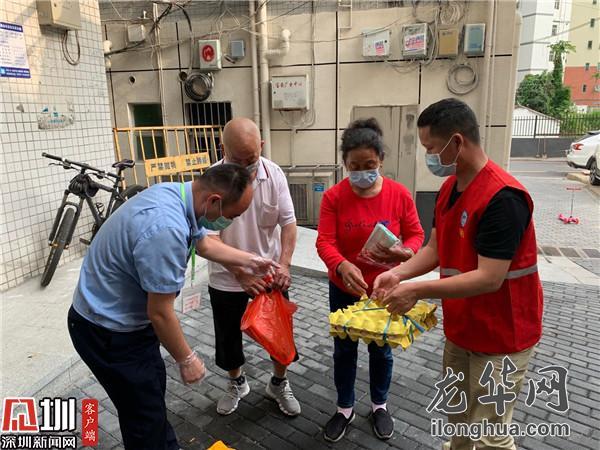 福城楼栋长给湖北籍老人送口罩跟生活用品。