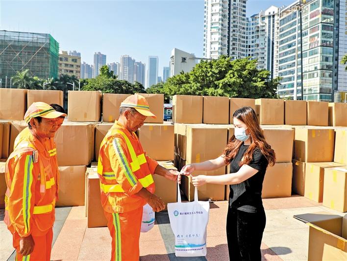 10月26日上午,龙华广场上热闹非凡,龙华区城管和综合执法局为辖区环卫工人发放节日礼包,祝福这一群可敬可爱的“橙衣人”节日快乐。