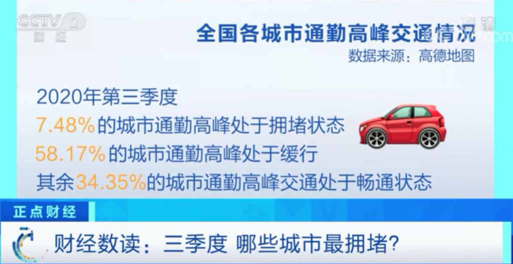 据高德数据显示三季度,全国有7.48%的城市通勤高峰处于拥堵状态。