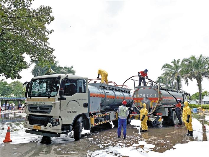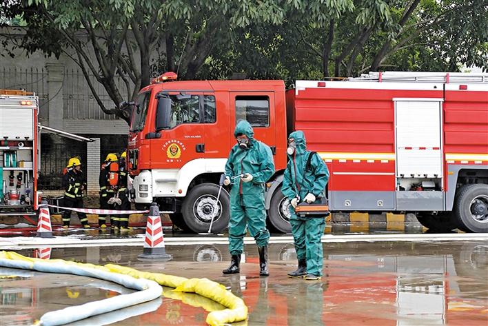 在演练过程中,现场指挥官临危不乱,及时调出消防大队及环境污染应急处置队伍紧急处理。其中,龙华消防大队立即对槽车泄漏点实施堵漏作业,并用泡沫对泄露的废汽油进行覆盖,阻止油蒸汽挥发扩散;市生态环境局龙华管理局准确报告事件信息,确定应急监测方案并实施应急监测,确认污染物浓度与影响范围,同时立即展开现场执法调查,确认油污进入污水管道的污染情况,并跟踪污染物去向;龙华区水务局指导并协助观澜水质净化厂实施污染物拦截与清理工作;东江环保在消防大队堵漏作业完成后实施倒罐作业,并设法堵住附近的雨水和污水井口,阻止油污继续进入污水管道……经过多方努力,事故现场得到有效控制,杜绝了重大环境污染事故的发生。