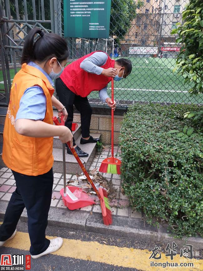 新牛社区第十红色网格团队成员在牛栏前新村文化广场开展清洁志愿者活动。