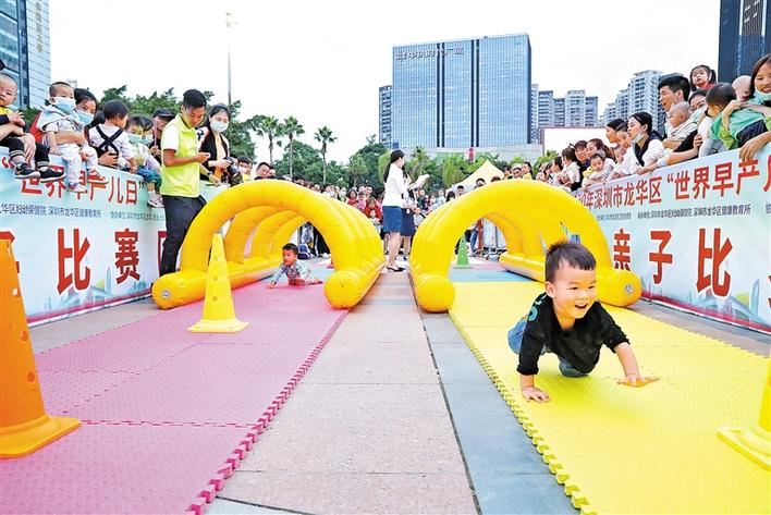 现场除义诊咨询区,还设置了有奖问答区、抽奖区、游戏互动区、亲子比赛区等区域,以生动活泼、互动体验的游园、儿童趣味比赛等方式,向市民宣传早产儿相关科普知识,营造良好的科学育儿社会氛围。其中,现场最热闹的就是宝宝爬行比赛。“宝宝,加油!用力往前爬,脚蹬起来。”每个家长都在给自家的宝宝呐喊鼓劲。参加比赛的小宝宝们各展萌态,有的小肚子一抬、双脚一蹬,努力爬向终点,也有的先声夺人,还没等喊“开始”就已先爬出第一步,逗乐了围观的家长,现场气氛轻松、愉快。