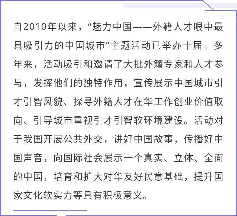 “魅力中国——外籍人才眼中最具吸引力的中国城市”主题活动每年举办一次。活动紧扣“城市开放与人才引进”这一主题,根据各城市在吸引外籍人才、服务外籍人才、发挥外籍人才作用等方面的总体状况,按照外籍人才“政策环境”“政务环境”“工作环境”“生活环境”“科创环境”五大标准及23项指标展开。活动力图在展示中国城市引才引智风貌的同时,探寻外籍人才在华工作创业价值取向,引导城市重视引才引智综合环境建设,以吸引更多高层次海外人才来华创新创业。