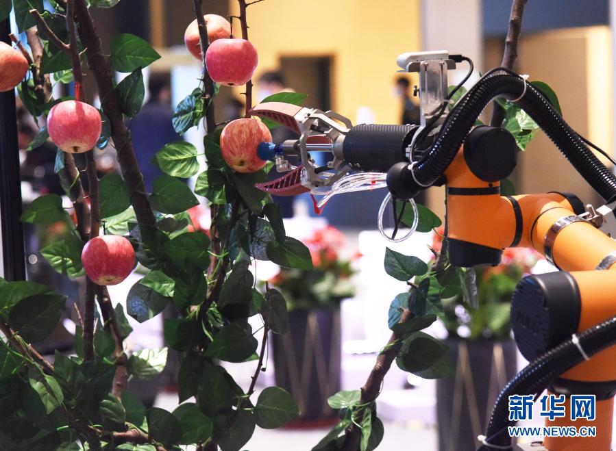 11月23日,一台苹果采摘机器人在成果展示现场演示。