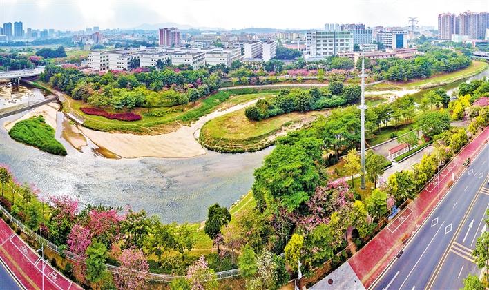 观澜河福城段水清岸绿,美丽异木棉绽放成为一道亮丽风景线。