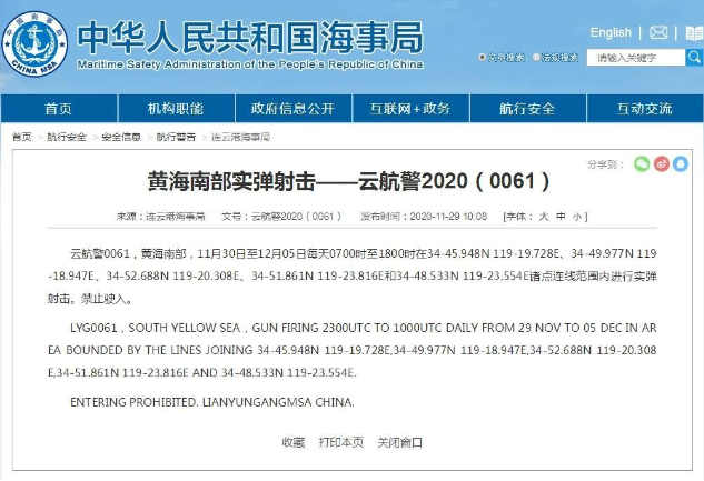 ⑤据中国海事局官网消息,连云港海事局发布航行警告,11月30日至12月05日每天7时至18时,黄海南部将进行实弹射击。禁止驶入。