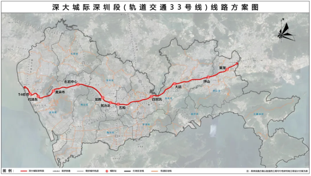 (深圳机场至大亚湾城际深圳机场至坪山段工程线路长69公里,全线共设站11座,其中枢纽站和换乘站10座,分别为T4枢纽、机场东、石岩中心、龙胜、民治北、五和、白泥坑、大运、坪山、聚龙;普通站1座,为黄麻布;均为地下线和地下站。)