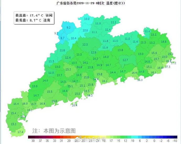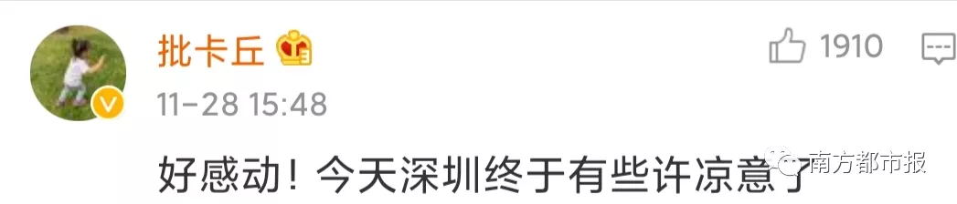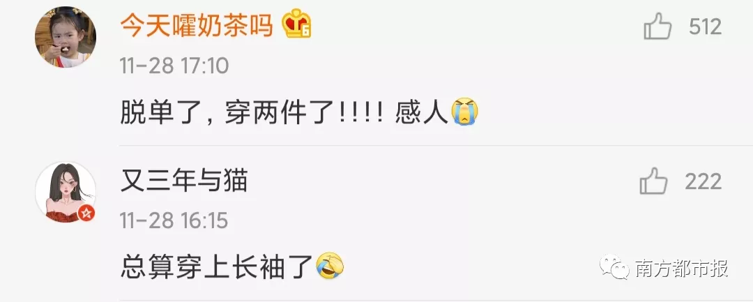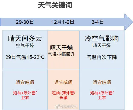 在深圳的你,今天一早穿外套了吗?这几天,受冷空气的影响,广东各地气温有明显下降。 不少网友表示,自己终于“脱单”了。 广东多地最低气温创今年下半年新低,受冷空气影响,29日早晨深圳市区最低气温16度,29日早晨8时整点气温排行来了(单位:℃)↓↓ 韶关11.1、梅州13.2、清远13.3 云浮13.7、河源13.8、佛山14.5 惠州14.7、广州14.9、潮州15 江门15.1、肇庆15.3、湛江15.4 揭阳15.7、茂名15.7、东莞15.8 阳江15.8、中山15.9、汕尾16 深圳16.1、珠海16.2、汕头17.3 昨天上午,你还是只穿短袖出门的深圳人吗? 今天最低温15℃,多云间晴天;东北风3-4级,阵风6-7级,相对湿度45%-70%。 深圳创最晚入秋纪录 据中央气象台,北方多地小到中雪或雨夹雪,气温降至零下的时候,我国华南南部地区还是一派夏日景象。目前,广东沿海等地入秋时间已偏晚,深圳、汕头已创下,有气象记录以来最晚入秋纪录。 据@深圳天气,深圳于4月26日入夏,目前暂未入秋,与平均入秋时间相比(11月3日),已偏晚27天,破最晚入秋纪录(2015年11月25日)。 时至今日,深圳今年夏季已长达218天(ps:一年仅365天),不过实际上怎么样才算入秋呢? @广东天气表示,气象上的入秋是指连续5天日平均气温在22°以下。 常年入秋时间如下↓↓ 然而今天已经11月30日了呢广东人冷静!好消息来了! 中央气象台预计,本周末冷空气的影响持续,将推进华南地区的入秋进程,广州深圳等地有望迎来气候意义上的秋季,所以别着急,气候意义上的入秋,指日可待了。 至于体感上……据@广东天气30日早7时许消息,11月29日冷空气持续补充,大清早中南部体感温度只有十多度,北部个位数,“冻冻”的有木有,不过白天阳光加持又会暖起来。 深圳未来天气 冷空气持续补刀 入秋真的有望 据深圳气象台28日下午15:22发布: 29-30日冷空气继续补充影响,晴天间多云,空气干燥,早晚清凉;沿海、高地和海区阵风6-7级。12月1-2日晴天间多云,气温小幅回升;3-5日受新一股冷空气影响,气温再次下降。 划重点: 30日和今天(29日)差不多,但还会冷一点,针织衫、外套啥的也可以安排了! 1-2日气温小幅回升,说不定那时候已经入秋了,也不会热到哪里去了! 3-4日冷空气又来,气温将再次下降。 简单来说,依旧天晴干燥,但早晚比较冷,倔强的短袖党也不要逞强啦!出门还是要带件外套哦,穿衣指南mark住↓↓ 除了“洋葱式”穿衣,纠结晚上要不要换厚被的盆友,还可以采用“洋葱式”盖被,准备两床薄被,升温盖一层、降温盖两层。