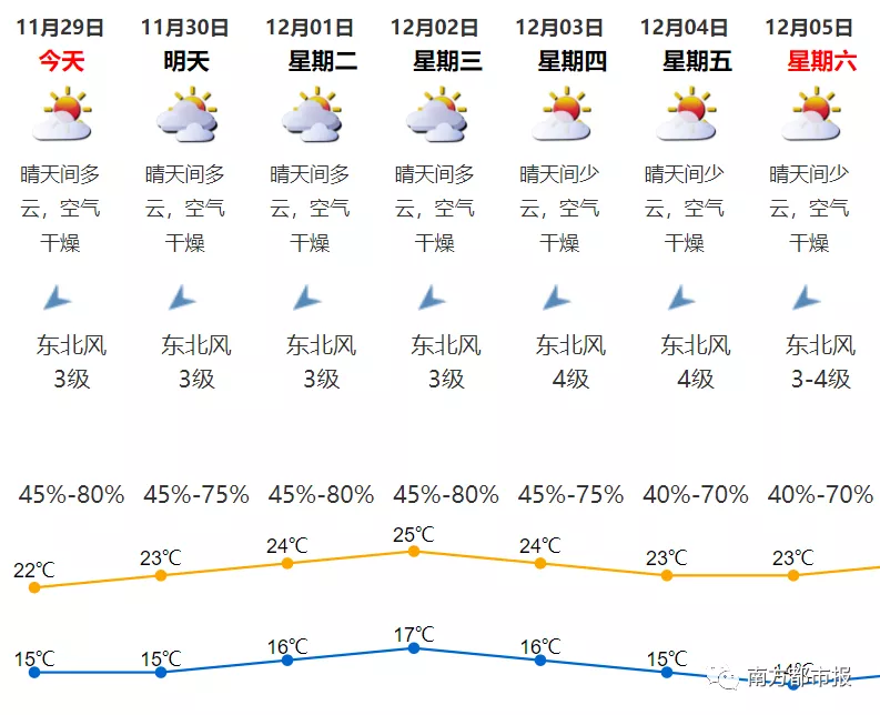 29-30日冷空气继续补充影响,晴天间多云,空气干燥,早晚清凉;沿海、高地和海区阵风6-7级。12月1-2日晴天间多云,气温小幅回升;3-5日受新一股冷空气影响,气温再次下降。3-4日冷空气又来,气温将再次下降。