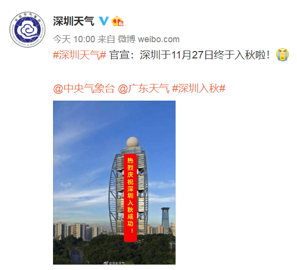 在11月最后一天的大清早,深圳天气宣布了一则重要事项:深圳入秋终于成功啦