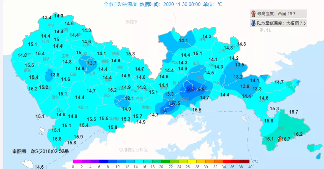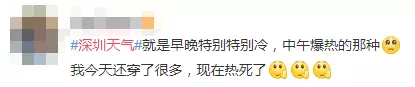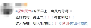 见圳客户端·深圳新闻网2020年12月1日讯 大家这两天有没有感觉到气温明显下降,小编今早差点因为被子太薄被冻醒…该来的终于来了↓↓↓ 在11月最后一天的大清早,深圳天气宣布了一则重要事项:深圳入秋终于成功啦 @广东天气和@中央气象局纷纷发来贺电。 深圳今年入秋比平均入秋时间(11月3日)晚了24天,而且破了最晚入秋纪录(2015年11月25日)。 能够让深圳入秋的降温到底有多猛? 看看昨天早上的我市气温,让人咧着嘴直呼:“好家伙!” ▲11月30日早晨8点气温。这几天接连降温,已让我市周末的最低气温降至15℃左右。 到了中午也凉得清爽,这,妥妥就是秋天的温度! 早上起床上班的各位,有没有在寒风中瑟瑟发抖?打开微博一看,深圳天气甚至冷上热搜。 这段时间,深圳人早上出门冷,中午太阳晒着又有点热,在11月的尾巴再度过上了乱穿衣的季节。 总算是送走了“夏常在”迎来了“秋答应”,“最晚的秋天”终究还是来了。 那么,深圳入秋后又有哪些变化呢? 降温幅度大,昼夜温差加大 根据近10年气象数据分析,深圳入秋前后1个月的气温降幅达5.1℃。同时昼夜温差加大,入秋前1个月的昼夜温差为5.9℃,入秋后达到6.3℃。 降雨减少,天气更加干燥 降水方面,深圳入秋前后1个月的平均累计雨量减少20%,干燥日数(日最小相对湿度≤50%)增加0.5天。 大家为降温备衣物的同时也别忘了大深圳天气是随机播放的 ▼ 12月1-2日,冷空气会短暂休息,我市气温会小幅回升,阳光较好。3-4日,又有一股冷空气要来光顾深圳了。 具体预报 未来一周天晴干燥,早晚较凉,森林火险风险高。 周二至周三(12月1-2日)气温小幅回升;周四至周五(3-4日)北风加大,气温再次下降。 周六至周日(5-6日)气温短暂回升。 温馨提示 (一)干燥 未来几天天晴干燥,森林火险橙色预警信号生效中,居家请检查好家中电路,注意用电用火安全。 (二)谨防一氧化碳中毒 冷空气影响期间,日温差大,早晚较凉,请适量增减衣物。天气转凉,CO中毒事件时有发生。市民应及时检查维护燃气设施,使用时保持室内通风。一旦发现中毒事件,打开门窗,将患者移至通风处并注意保暖;中毒者若已昏迷,施救者应拨打“120”电话呼救(注意不要在煤气泄漏现场拨打电话或打开电源开关,以免发生爆炸)。 (三)大风 冷空气影响期间海面风力较大,提醒各位市民,请远离沿海和高地做好防风措施以及注意海上交通安全。 所以,秋天的第一顿火锅你吃了吗?打算和谁吃?