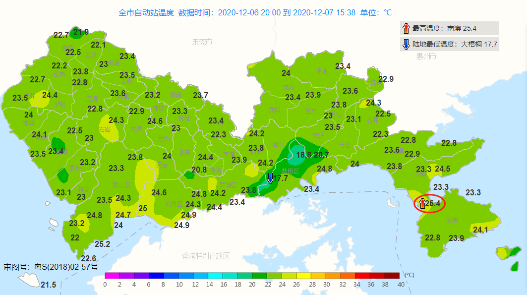 12月7日早晨市区最低气温15-16℃,较昨天回升3-4℃,有没有感觉没有那么冷了?白天气温逐渐回升,南澳自动站最高气温达到了25.4°C。