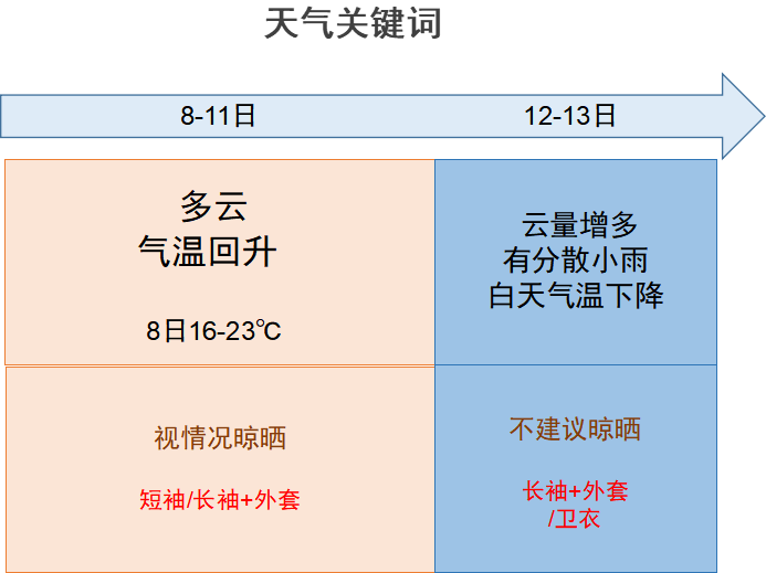 12-13日云量增多,有分散小雨,白天气温下降。温馨提示 1、未来几天早晚较冷,干燥持续,大家要适时补水,根据天气变化增减衣物,晚上盖好小被子,谨防感冒。2、森林橙色预警信号生效中,居家检查好家中电路,注意用电用火安全。