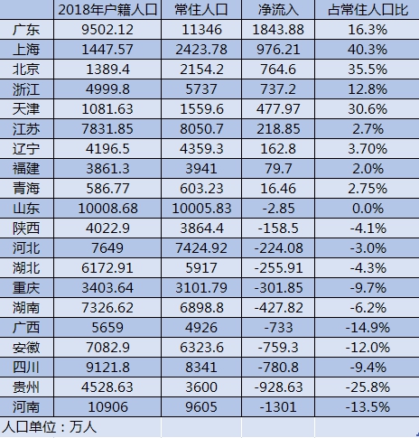 第一财经记者梳理了20个省份2018年户籍人口、常住人口数据后发现,长江中游、西南、河南等地人口密集,是主要的人口流出地;广东、浙江、上海、京津则是主要的人口流入地。
