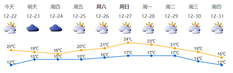 我市多云间晴天,空气干燥;气温12-20℃;东北风2-3级,沿海、高地和海区阵风5-6级;相对湿度45%-70%。