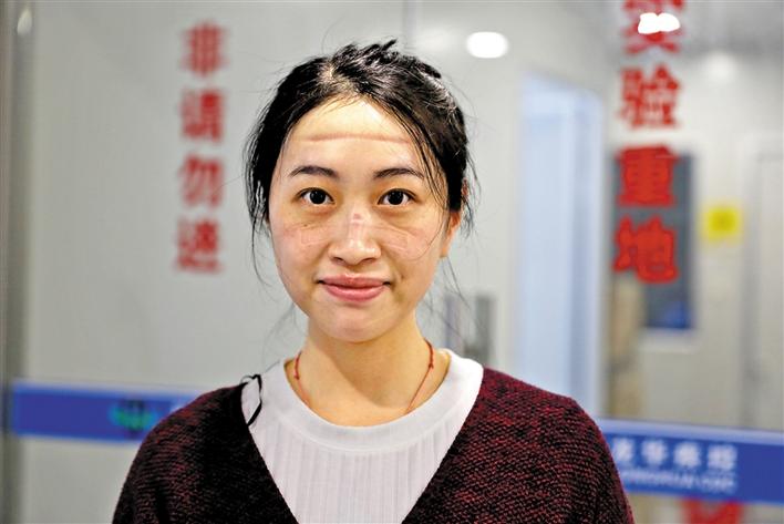 因长时间佩戴防护面罩,刚做完实验的区疾控中心检测人员赖晓玲的脸上留下了深深的印记。